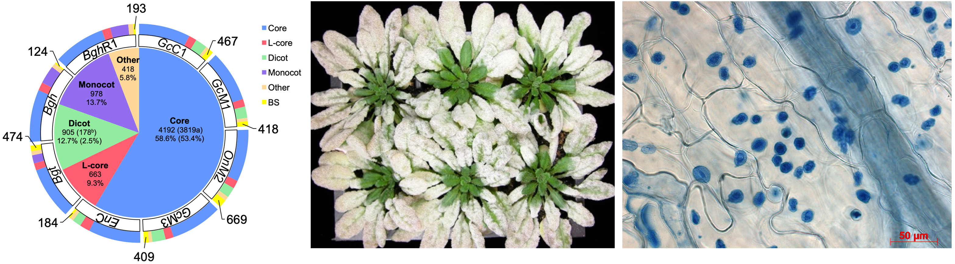 Powdery mildew (PM) is one of the most important and widespread crop diseases that constantly affect plant production. PM is caused by obligate biotrophic ascomycete fungi in the order of Erysiphales. Because PM fungi cannot be cultured or transformed, it is very difficult to study this important group of pathogens by conventional genetic approaches. To tackle this challenge, we have recently sequenced the genomes of four dicot PM biotypes. Through a comprehensive comparative analysis of all available PM genomes, we have identified highly conserved as well as lineage-specific candidate effector genes. Currently, we are conducting comparative genomics-guided, ectopic expression (i.e. in host cells)-enabled, functional studies of key candidate PM genes to understand and intervene PM pathogenesis. We are also utilizing a higher-order Arabidopsis mutant that is super-susceptible to many different non-adapted powdery mildew species for the identification of powdery mildew genes essential for suppressing host immunity.