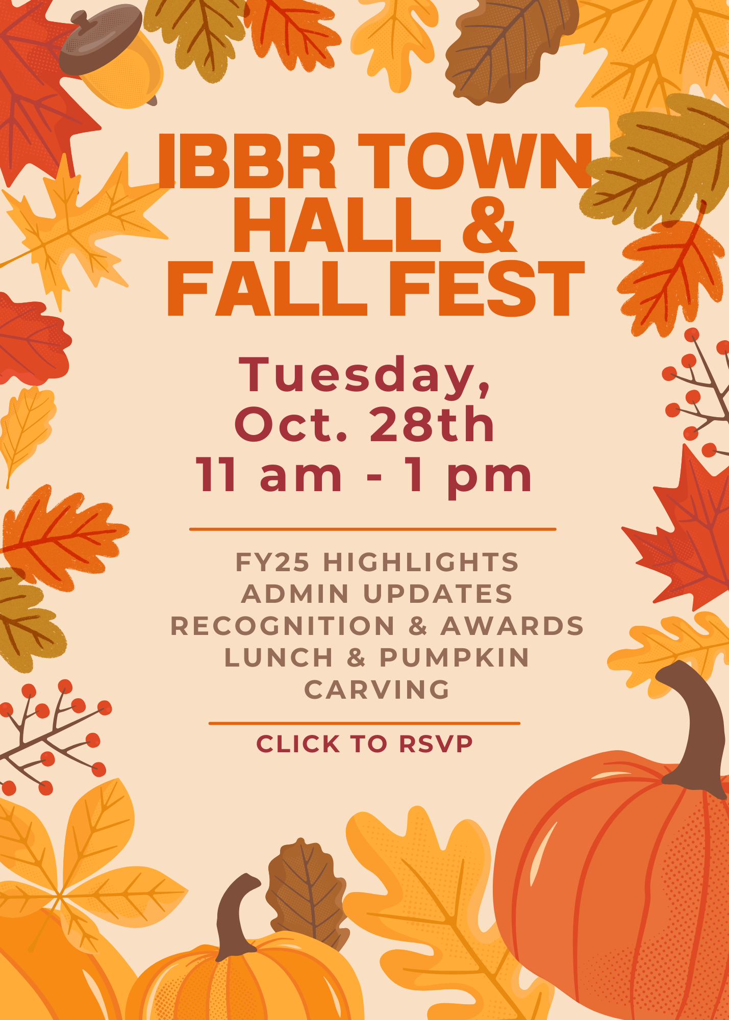 IBBR's Fall Fest and Town Hall will take place on Tuesday, October 28th from 11 am-1 pm. Please take the time to RSVP so we have an accurate headcount for lunch.