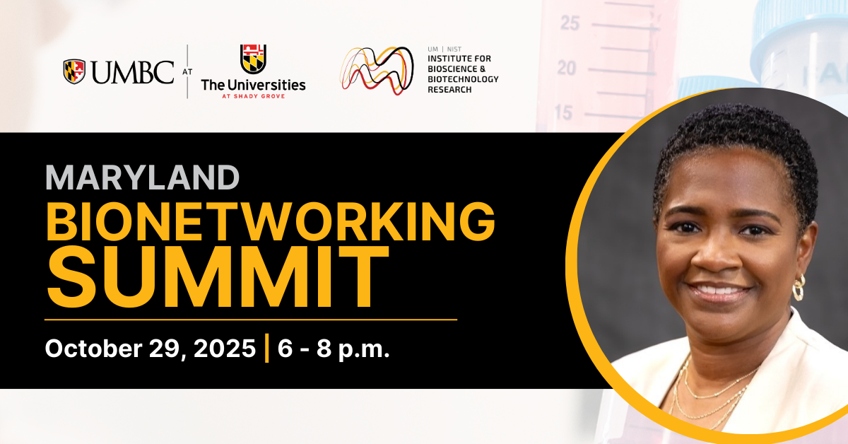 Please join us on Wednesday, October 29th from 6-8pm for our bioscience-focused networking event series designed to highlight the area’s unique life science ecosystem and to promote interactions between its diverse stakeholders. Sponsored and organized by the University of Maryland, Baltimore County (UMBC), the Institute for Bioscience and Biotechnology Research (IBBR) – a joint partnership between the University of Maryland and NIST – and the Universities at Shady Grove, the event will bring together scientists from academia, government, and industry for an evening of science, networking, and socializing. The keynote speaker will be Dr. Annica Wayman, Deputy Director of The National Center for Advancing Translational Sciences (NCATS), where she will present "Accelerating Biomedical Research to Healthcare Solutions."