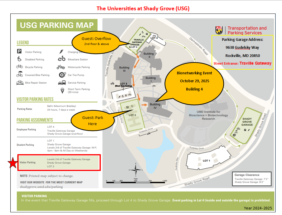This in-person evening event will consist of a networking social with refreshments followed by a talk at the Biomedical Sciences and Engineering (BSE) Education Facility at the Universities at Shady Grove in Rockville. Free parking is available in Lot 2 adjacent to the BSE (Building IV) as well as street parking. Please bring your parking ticket in with you and we will provide you with a validation at registration. Please click here for an interactive map.