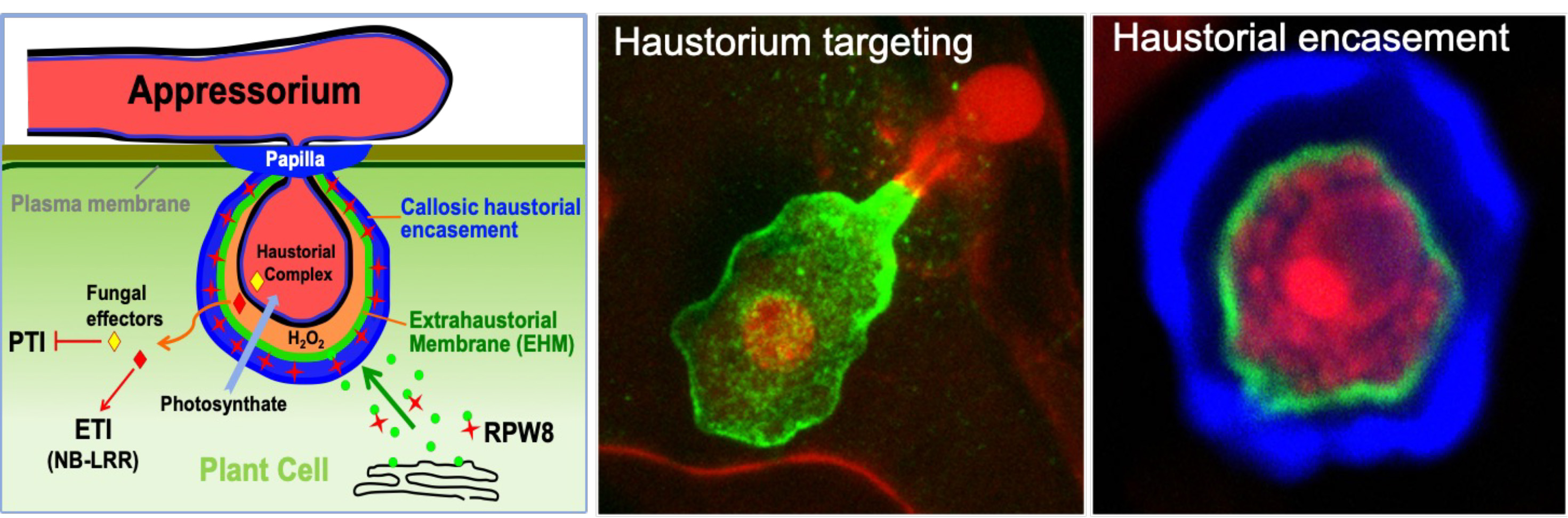 RPW8 is an atypical resistance protein identified in Arabidopsis that is specifically targeted to the extra-haustorial membrane—the enigmatic host-pathogen interface, where RPW8 activates defenses to constrain the fungal feeding structure, i.e. the haustorium. We aim to (i) understand how RPW8 is targeted to, and activates defenses, at the host-pathogen interface, (ii) investigate the the origin & biogenesis of the extra-haustorial membrane and its role in host defense and fungal pathogenesis, (iii) identify more host and fungal proteins interacting at the interfacial membrane, and (iv) engineer novel resistance against powdery mildew in plants.