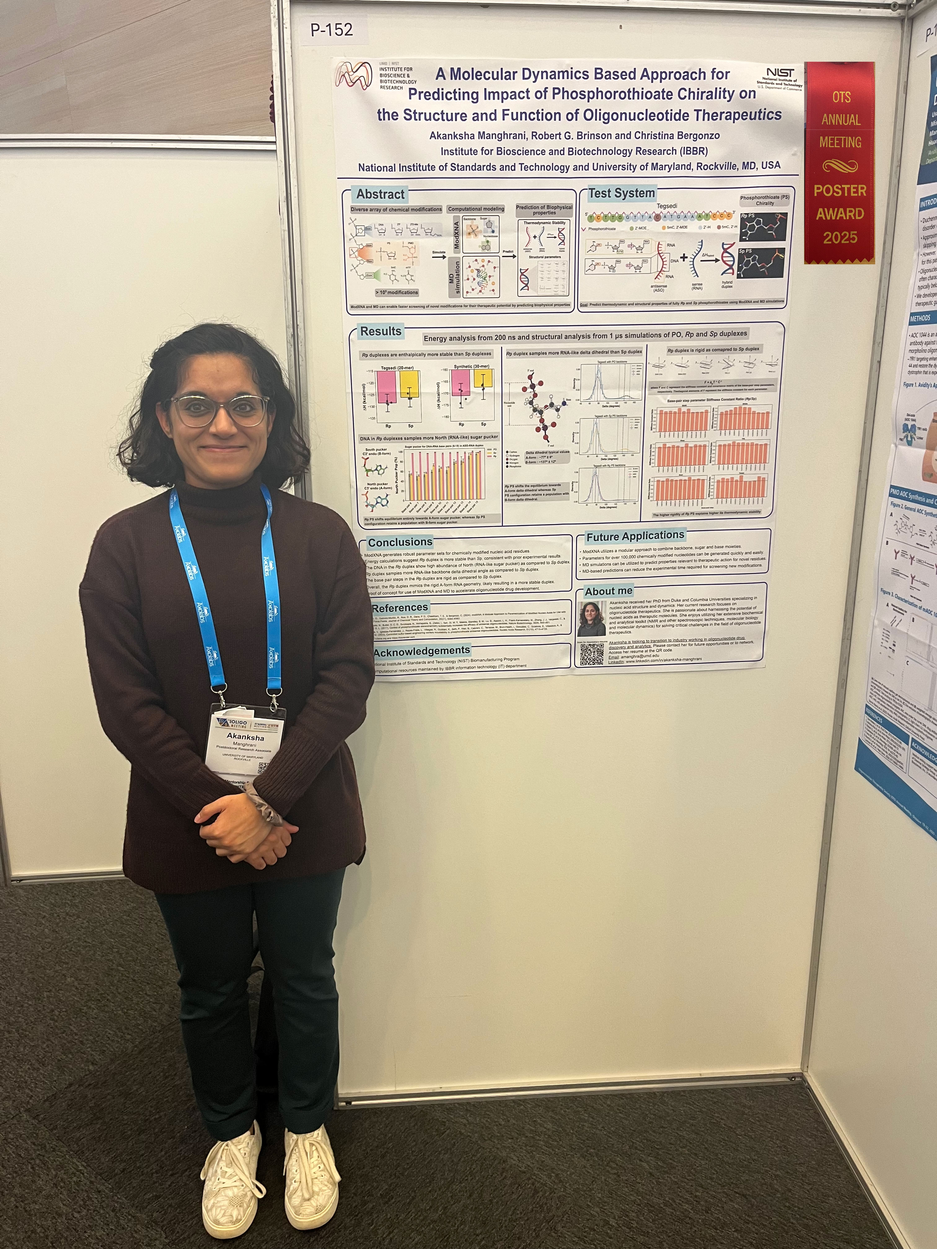 Akanksha Manghrani, a NIST–IBBR postdoctoral research associate in the Biomolecular Measurement Division of the Materials and Measurements Laboratory, received a poster award at the Annual Oligonucleotide Therapeutics Society (OTS) Meeting held in Budapest, Hungary this October. The OTS annual meeting is the premier global conference for researchers and industry leaders advancing oligonucleotide therapeutics - an emerging class of medicines with transformative potential. Akanksha’s work was recognized among the top 10% of presenters worldwide for research excellence. She has also been invited to share her research in greater depth in the OTS webinar series in spring 2026. In addition to the poster award, she received a competitive travel award from OTS.